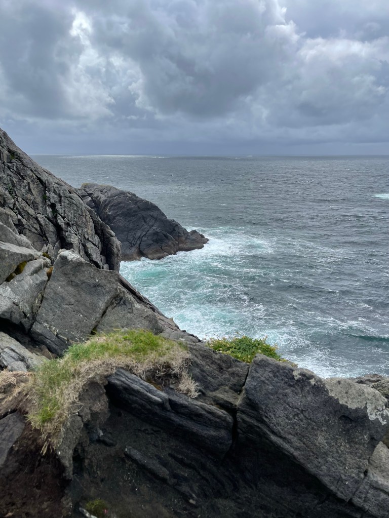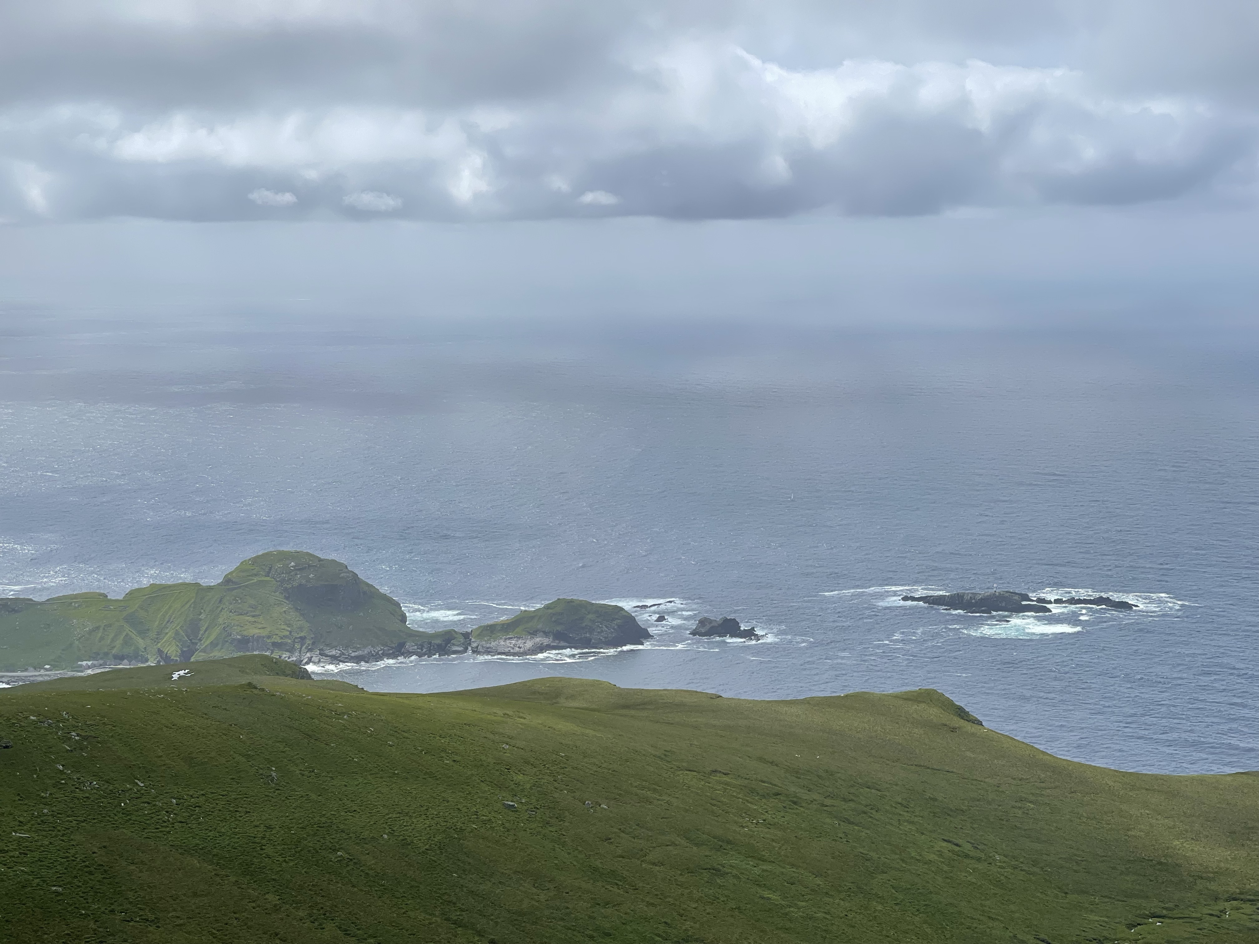 Nach etwa 1 1/2 Stunden erreichen wir das Westkap. 500 m über Meer mit einer grandiosen Aussicht auf die Küstenfjorde und Fjelle (Berge). Das Wetter spielt voll mit, es hat sogar ein bisschen Sonne und erstaunlich wenig Wind! Sehr cool dass wir diesen westlichsten Spot Skandinaviens bei gutem Wetter erleben dürfen😎
