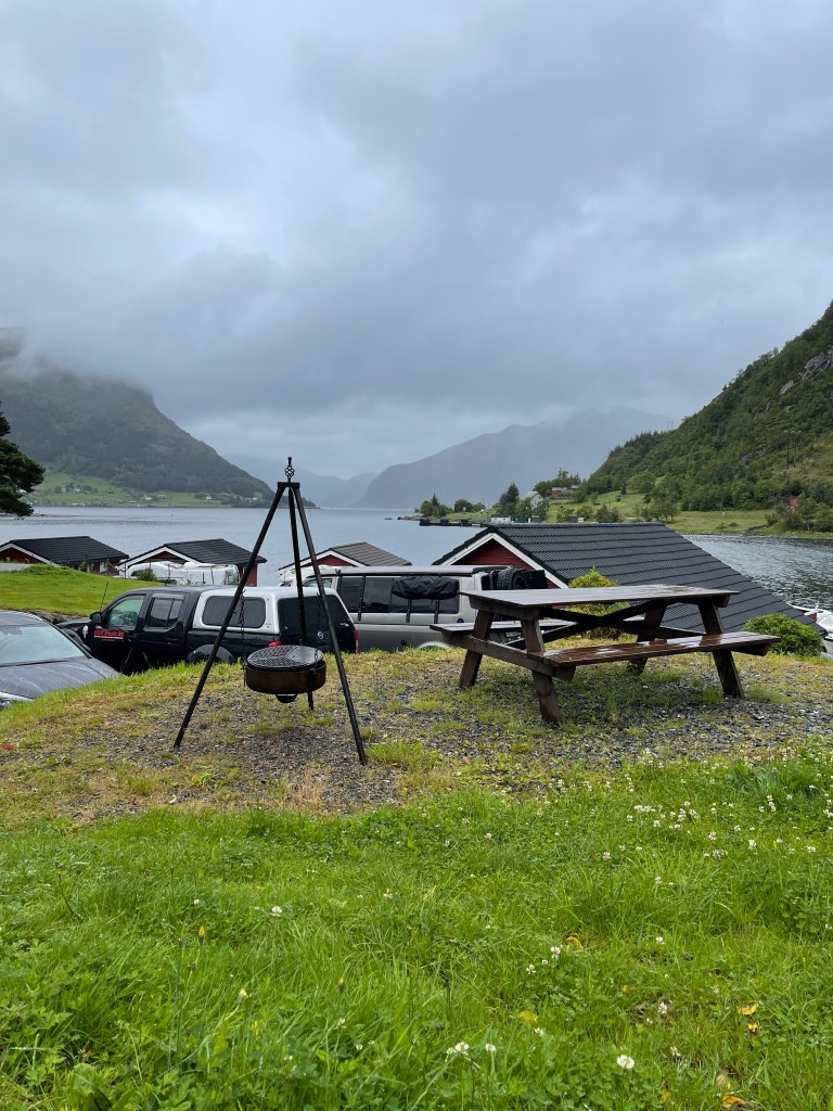 Danach fahren wir nach Åheim auf einen leeren Campingplatz am hintersten Ende einer Bucht des Vanylvsfjorden – es hat sogar ganz wenig Ebbe und Flut! Es ist ein bisschen sumpfig auf der Wiese – deshalb keine anderen Gäste 😉