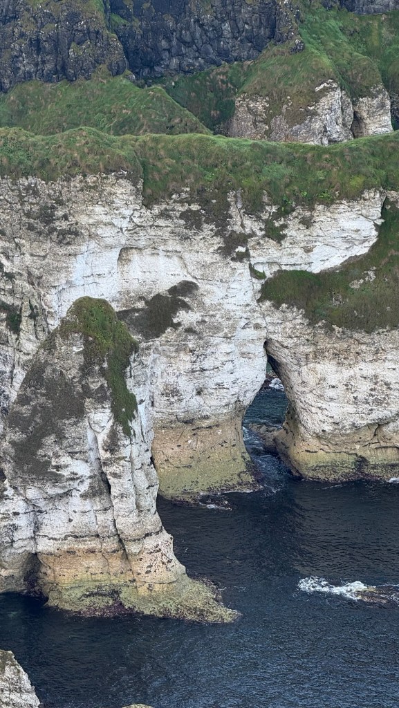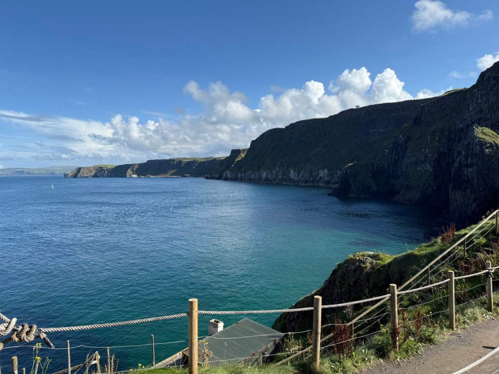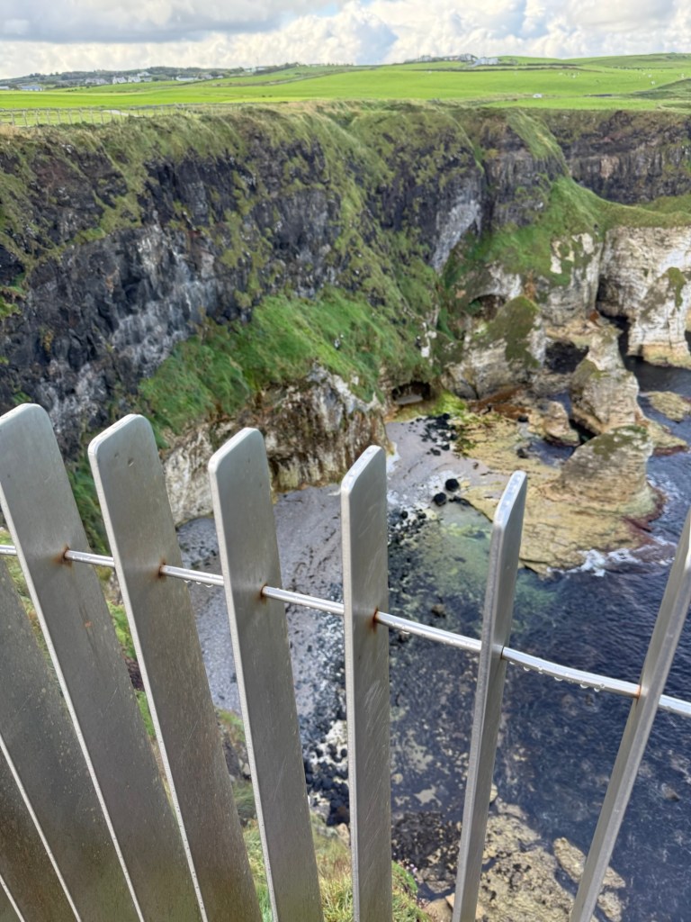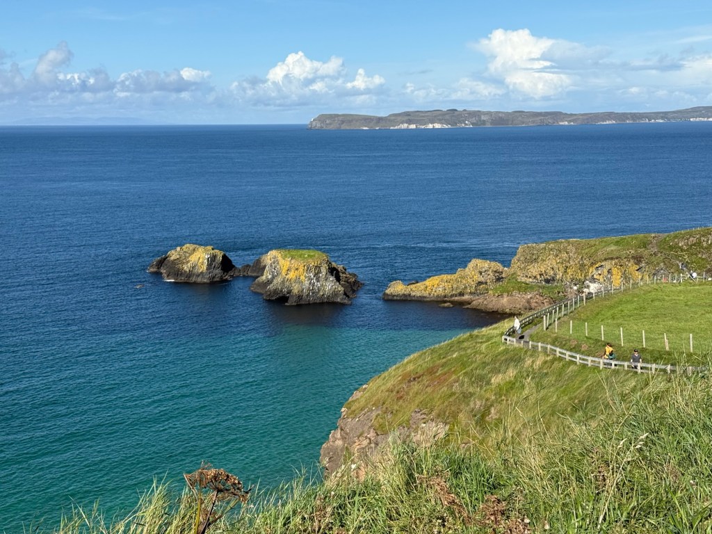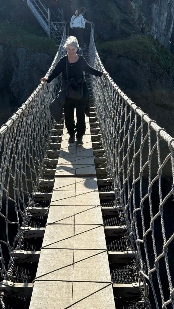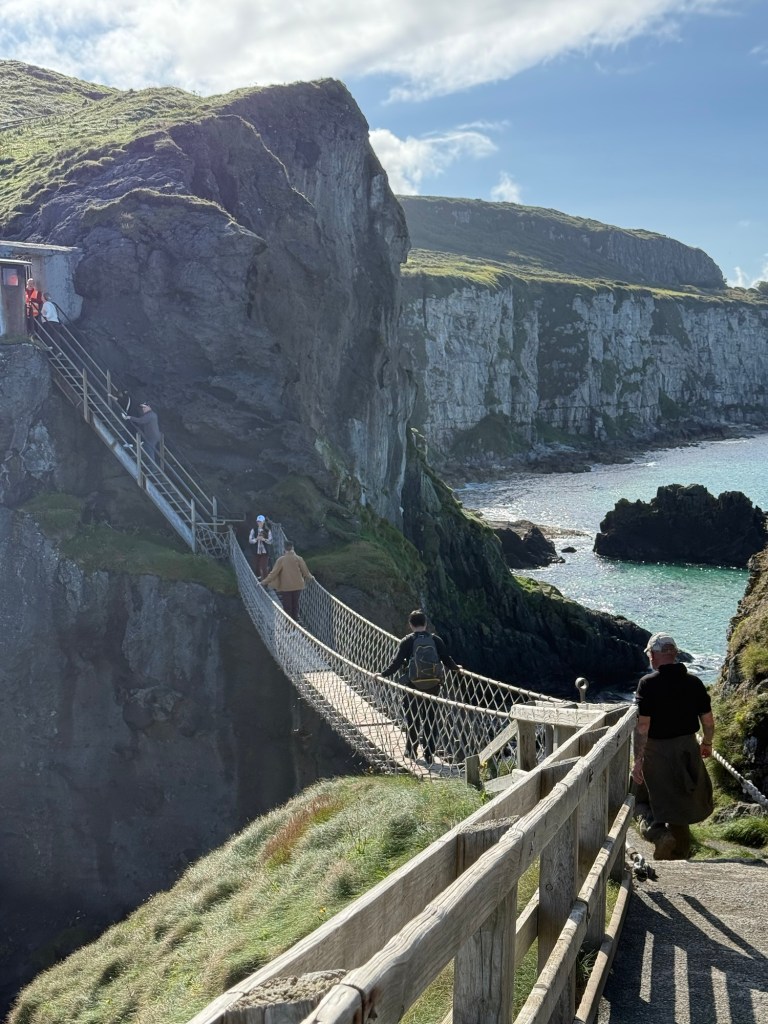Danach fahren wir weiter zur Carrick-a-Rede Rope Bridge und wandern vom Parkplatz aus auf und ab mit vielen Treppenstufen zur kleinen, aber doch eindrücklichen Hängebrücke, die Lachsfischer hier vor etwa 350 Jahren zum ersten Mal eingerichtet hatten. Die Seilbrücke ist 20m lang und es ist wirklich wackelig (!) 30 Meter über dem sprudelnden Meer.