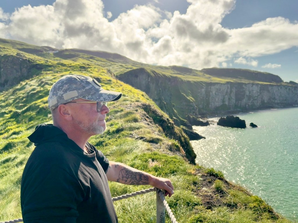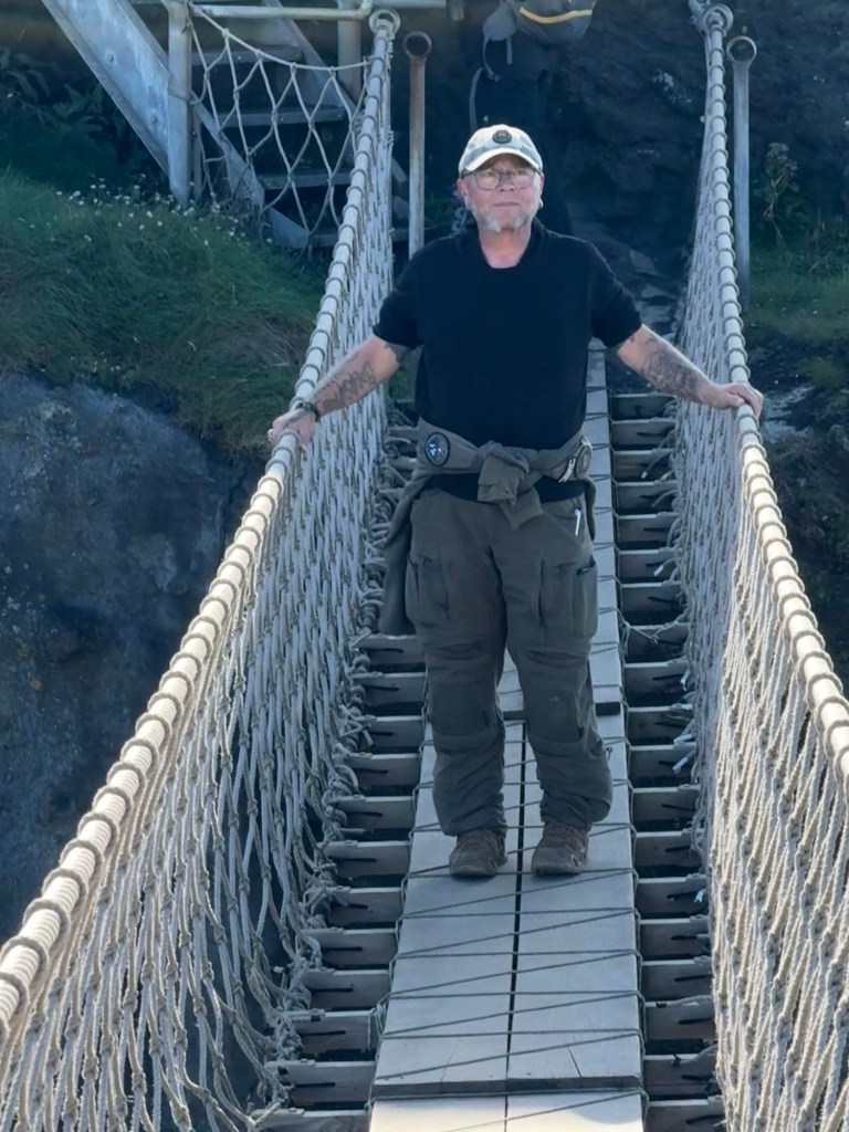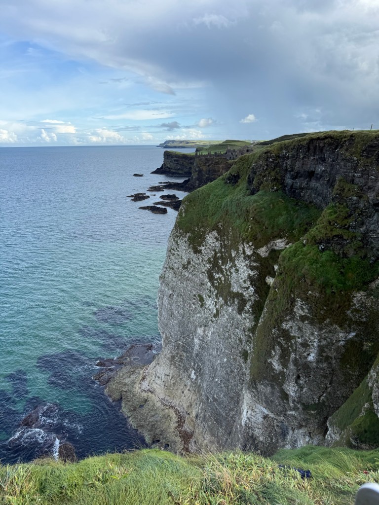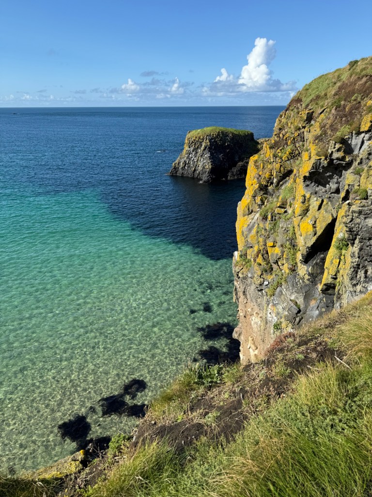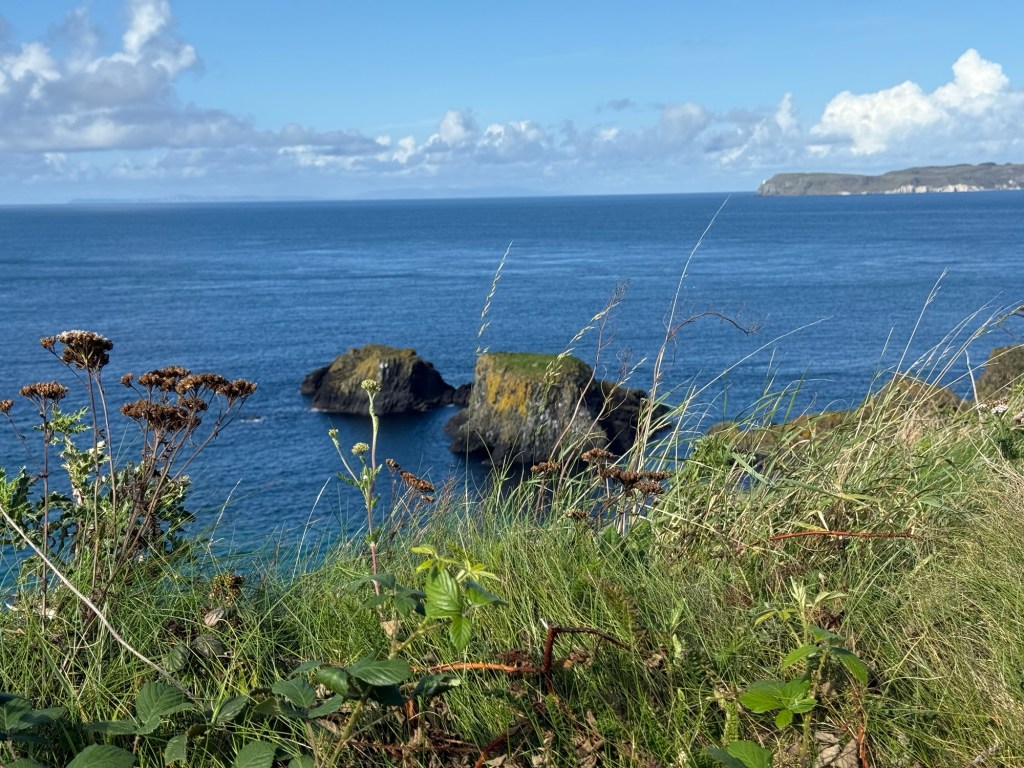 Danach fahren wir weiter zur Carrick-a-Rede Rope Bridge und wandern vom Parkplatz aus auf und ab mit vielen Treppenstufen zur kleinen, aber doch eindrücklichen Hängebrücke, die Lachsfischer hier vor etwa 350 Jahren zum ersten Mal eingerichtet hatten. Die Seilbrücke ist 20m lang und es ist wirklich wackelig (!) 30 Meter über dem sprudelnden Meer.