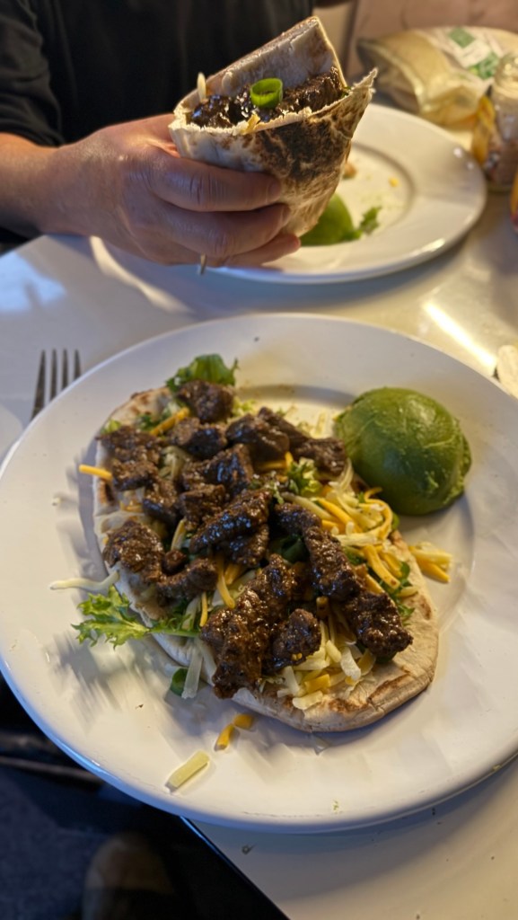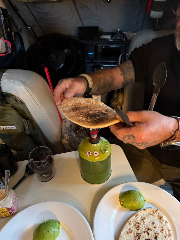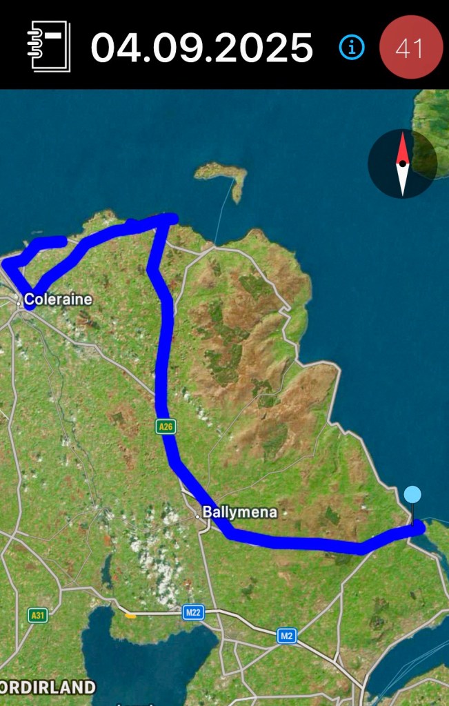 Weiter geht’s zum Hafen von Larne. Die 18-Uhr-Fähre schaffen wir aber nicht mehr – und weil wir nicht im Dunkeln nach einem Schlafplatz suchen wollen (die 20-Uhr-Fähre kommt erst nach zehn Uhr nachts an…), bleiben wir über Nacht auf einem kleinen Campingplatz in der Nähe des Hafens. Es gibt 🥂 zum Apéro (6 Wochen gereist ohne grössere Probleme oder Beziehungsknatsch😊 muss bisschen gefeiert werden) und dann leckere gefüllte Pita zum Znacht.