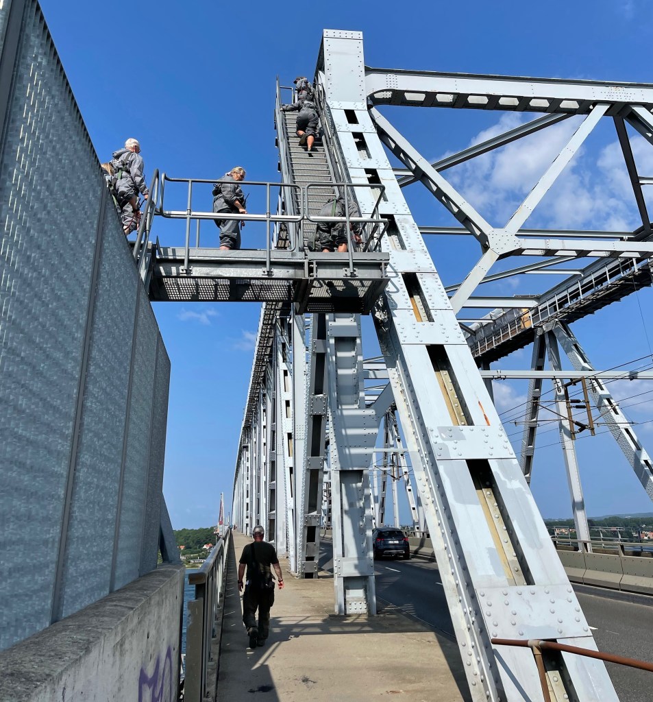 Die Insel Fynn erreichen wir über eine 6-spurige Autobahn-Brücke , zurück nach Jütland gehts dann zuerst zu Fuss (Aussicht!) und dann mit dem Bus auf der ebenfalls sehr hohen, alten Eisenbahn/Auto-Brücke. Die kann man auch, für viel Geld, in grauen Anzügen und am Geländer angekettet, auf der oberen Eisengitter-Konstruktion zu Fuss überqueren. Wer den Kick braucht? Wir nicht unbedingt…!