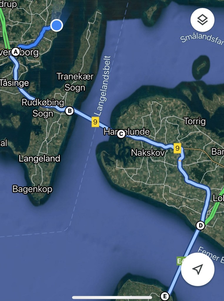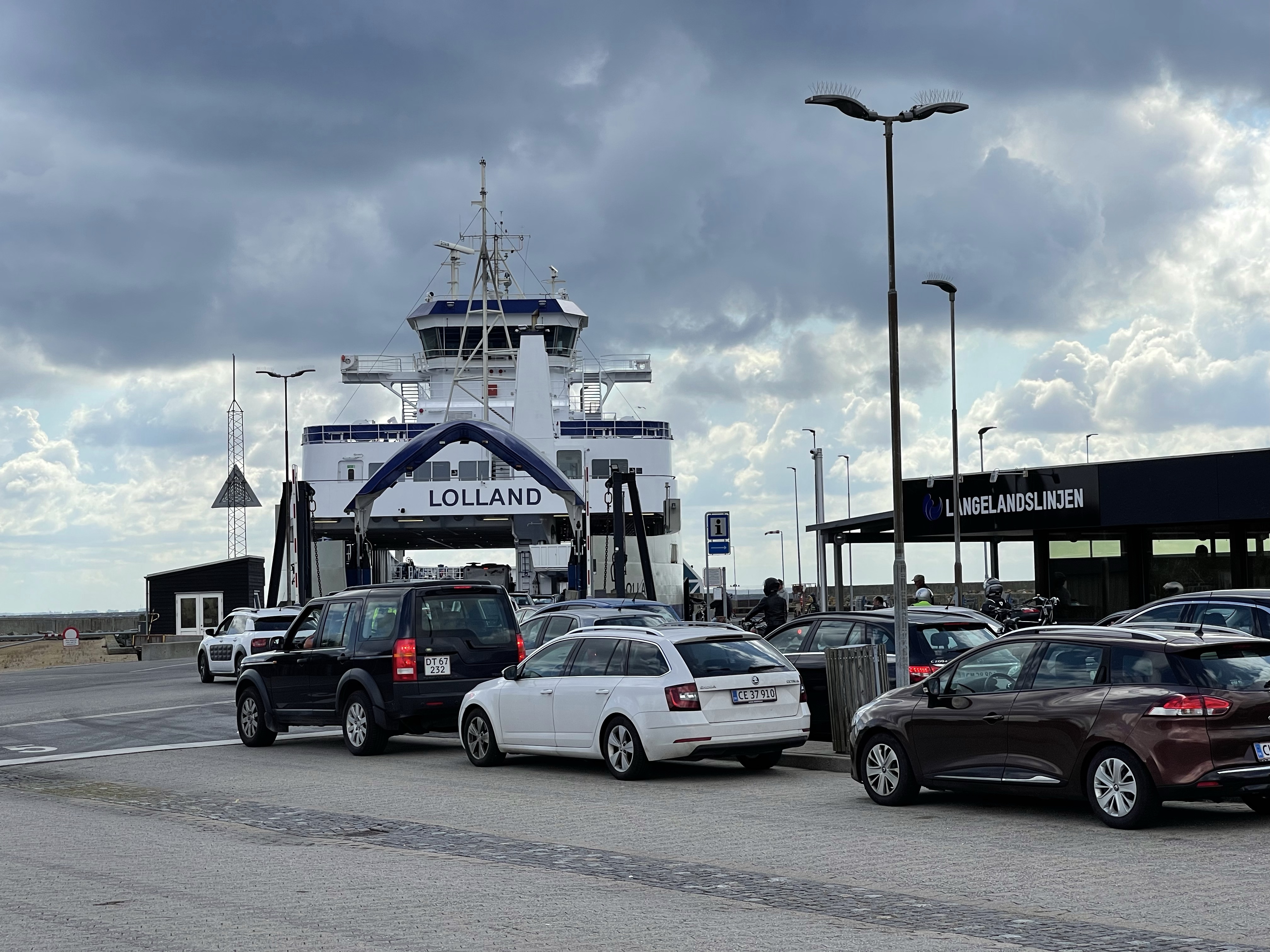 Die Nacht ist windig, aber trocken. Erst am Morgen beim Zusammenpacken kommen nochmals ein paar Tropfen. Wir fahren um 9 Uhr los über eine Brücke und einen Damm nach Rudkobing auf Langeland, dann auf die Fähre von Spodsbjerg nach Tars (Lolland).