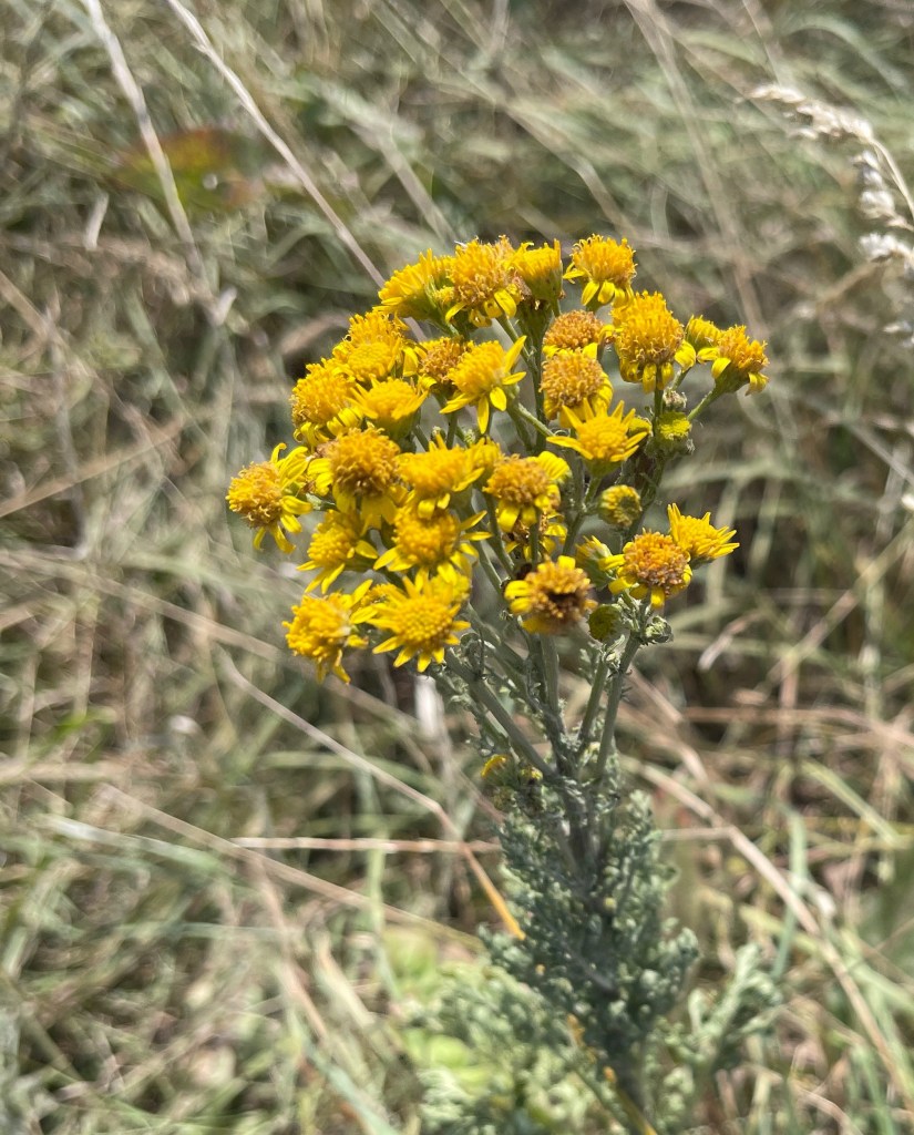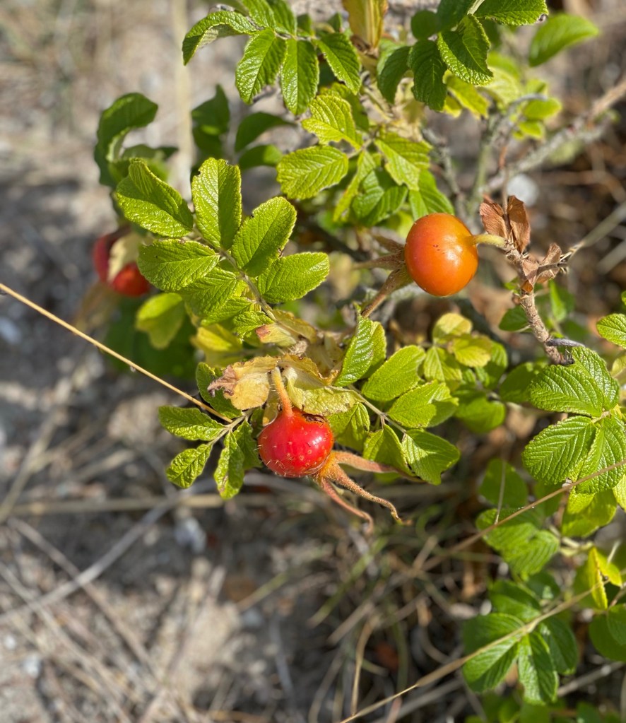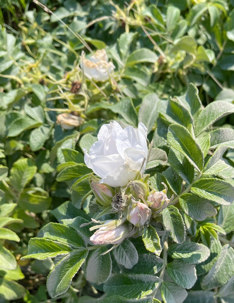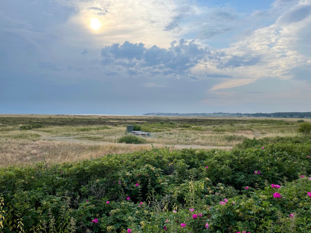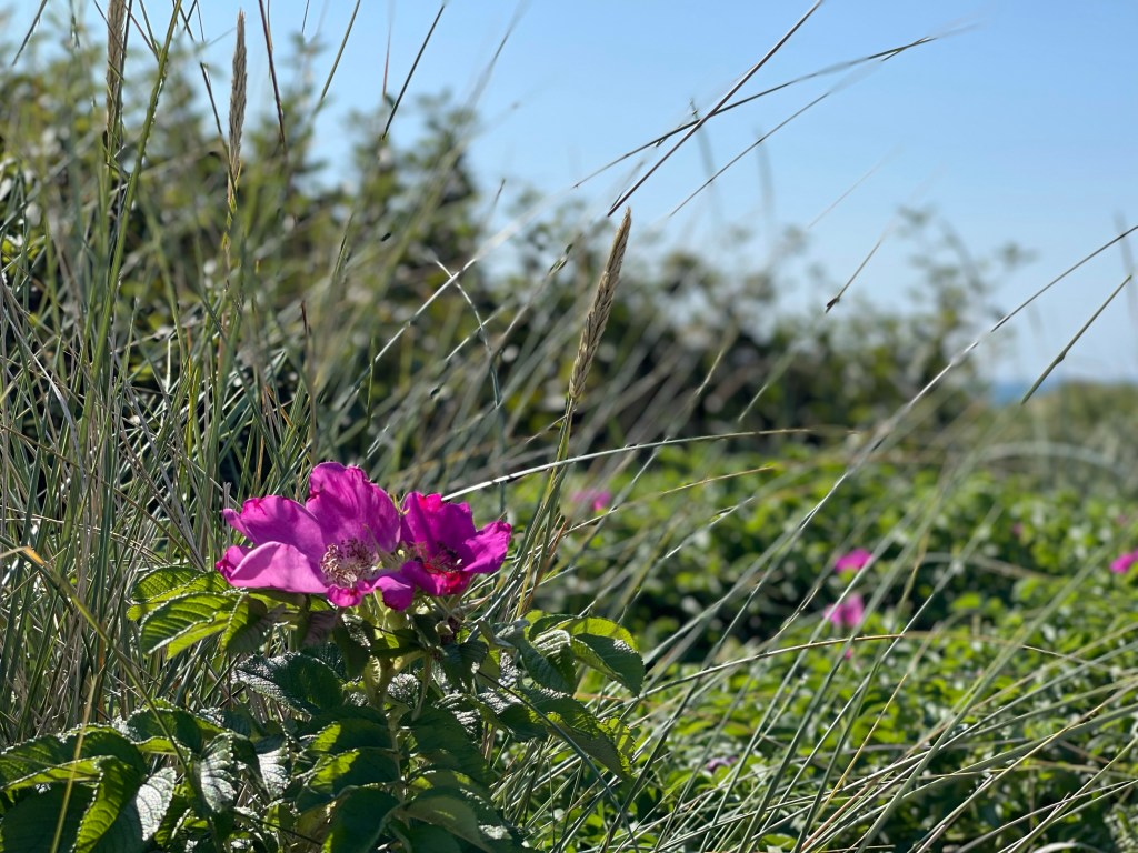 Die Dünen sind voll mit alten Rosen (Kartoffel- und Hunds-Rosen, wirklich buschig und stachlig), die blühen weiss und rosa überall und da geht niemand freiwillig durch. Denn das ist schlecht für die Dünen, man sollte nur die offiziellen Wege (mit Nummernschild) begehen. Überall sonst sieht man an Wegrändern und auf den Wiesen diese gelben und violetten Blumen, sie leuchten wunderbar, von weit und nah, so schön!