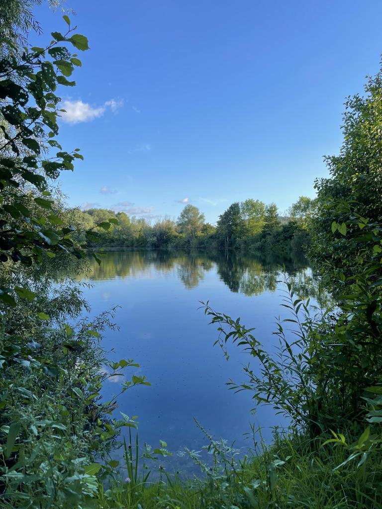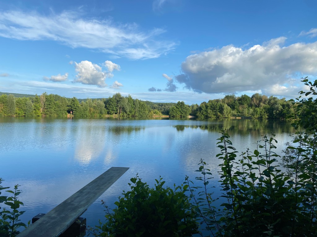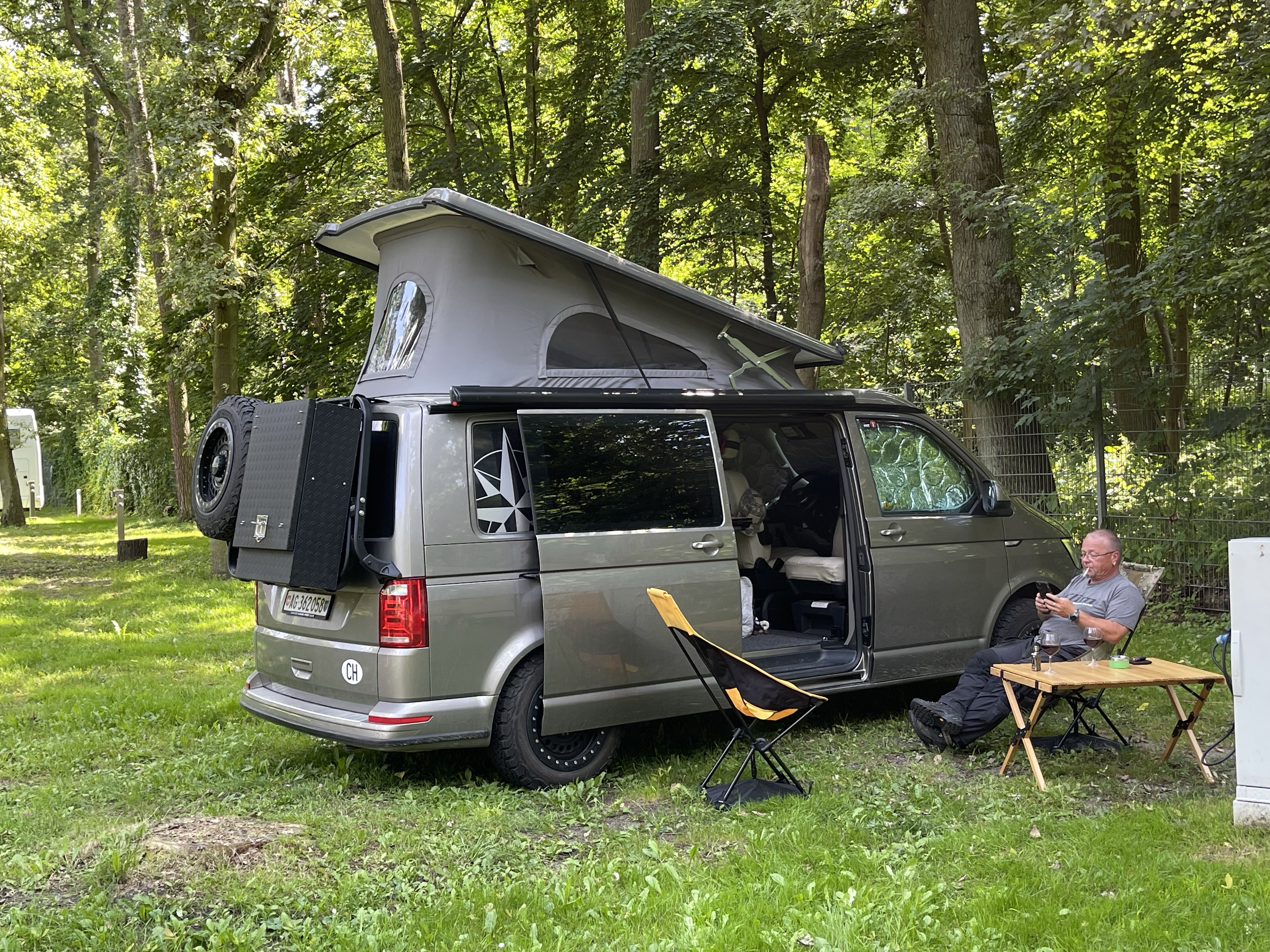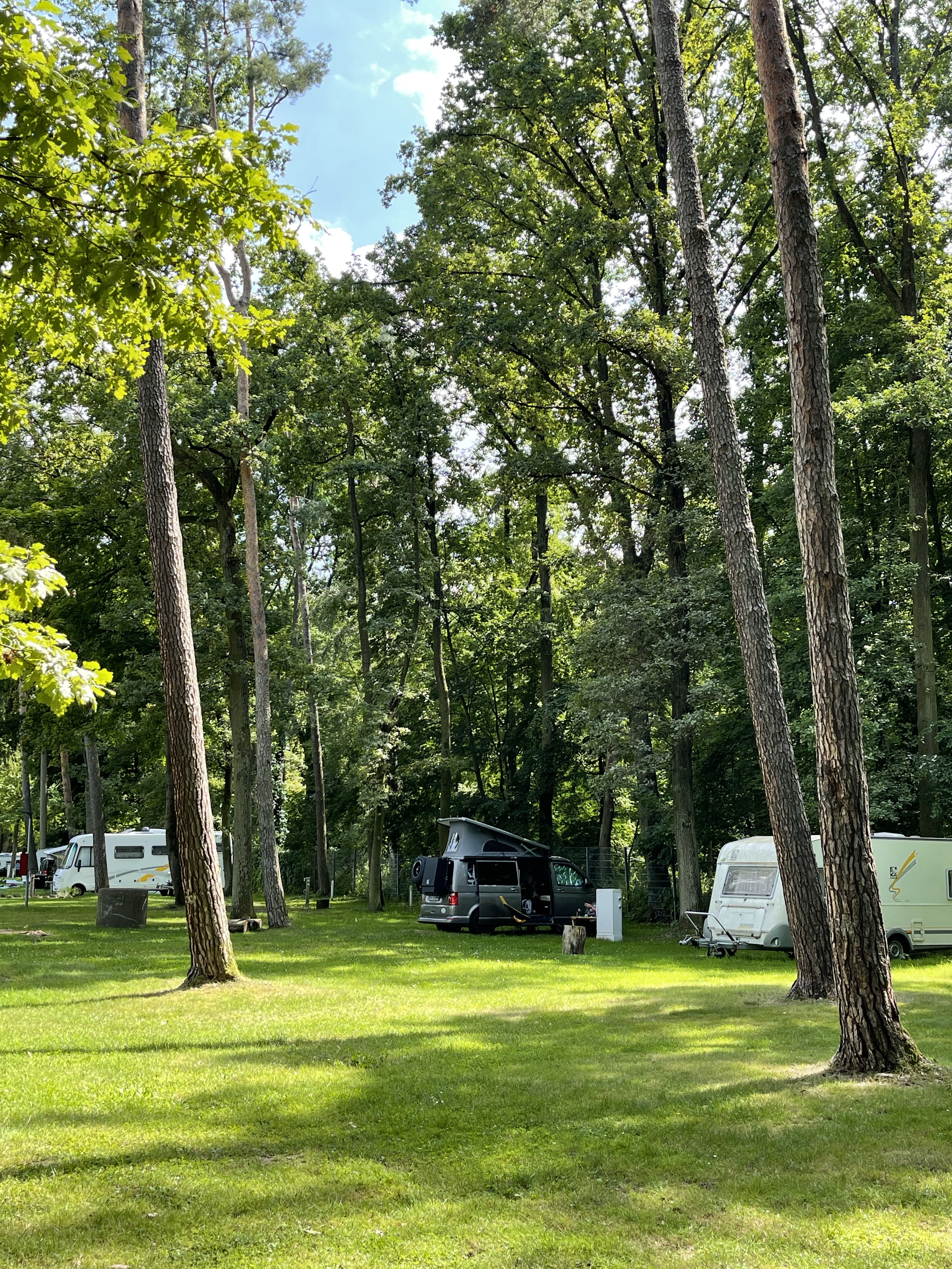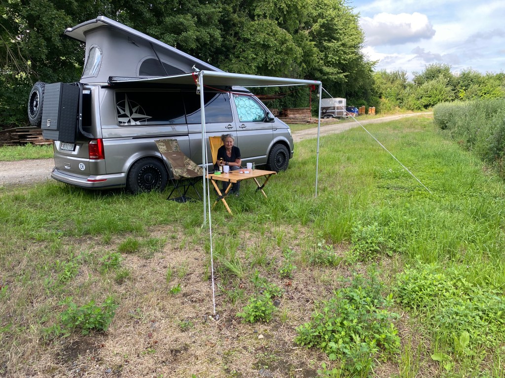 Die deutschen Autobahnen sind (Sonntag sei Dank) verkehrsarm, ein paar kurze Staus und zwischen Frankfurt und Kassel krasser Regen. Nach 600 km sind wir an unserem ersten Übernachtungsplatz südlich von Göttingen: Ein „Pop-up-Camp“ am Kies-See Klein Schneen, mitten im Grünen, mit der sehr herzlichen Gastgeberin Theresa.