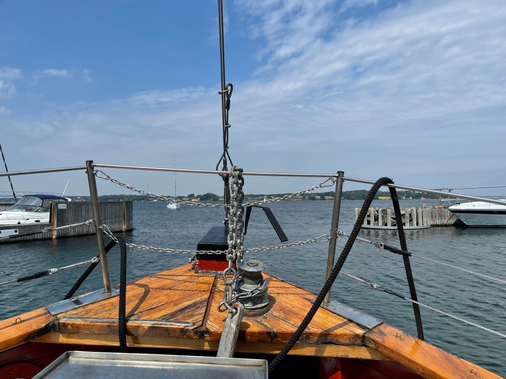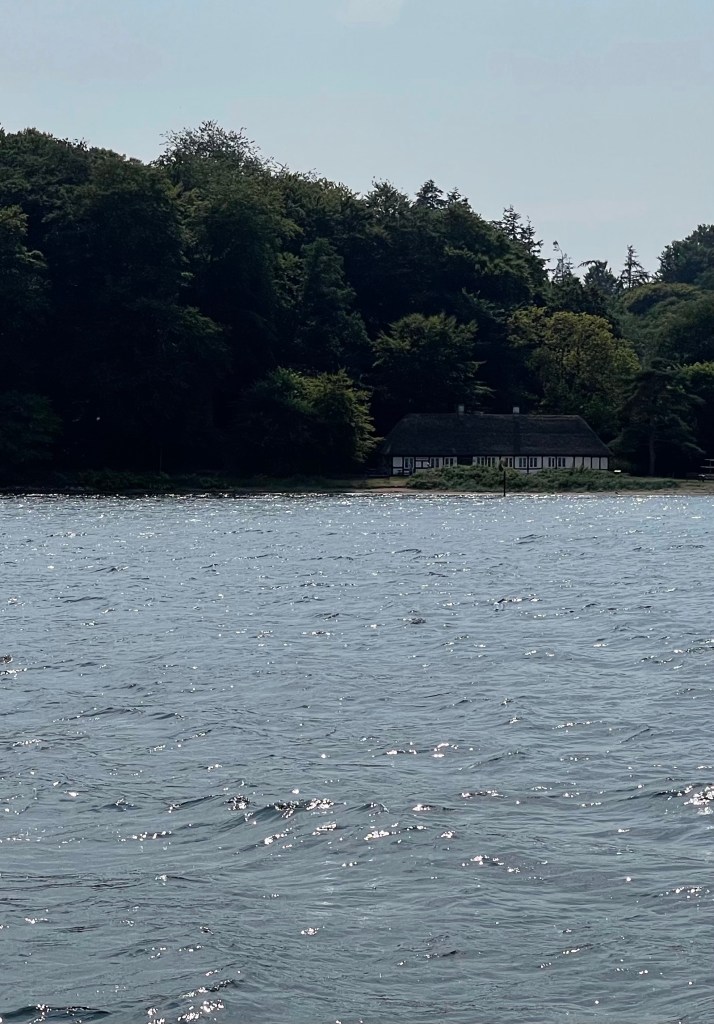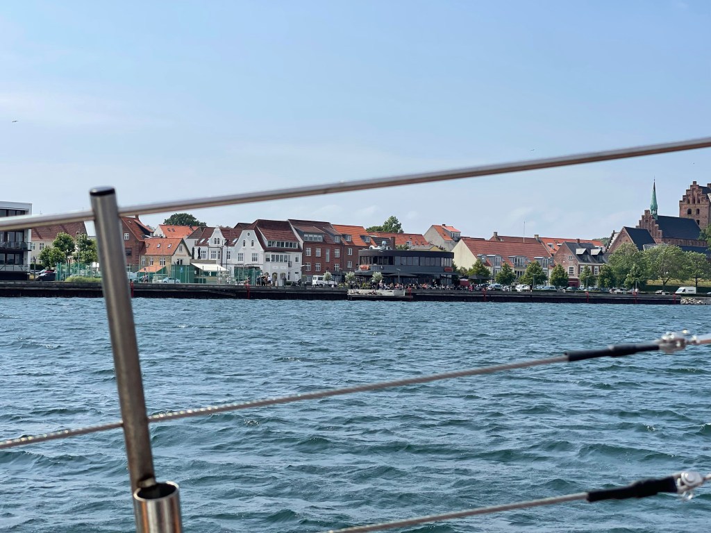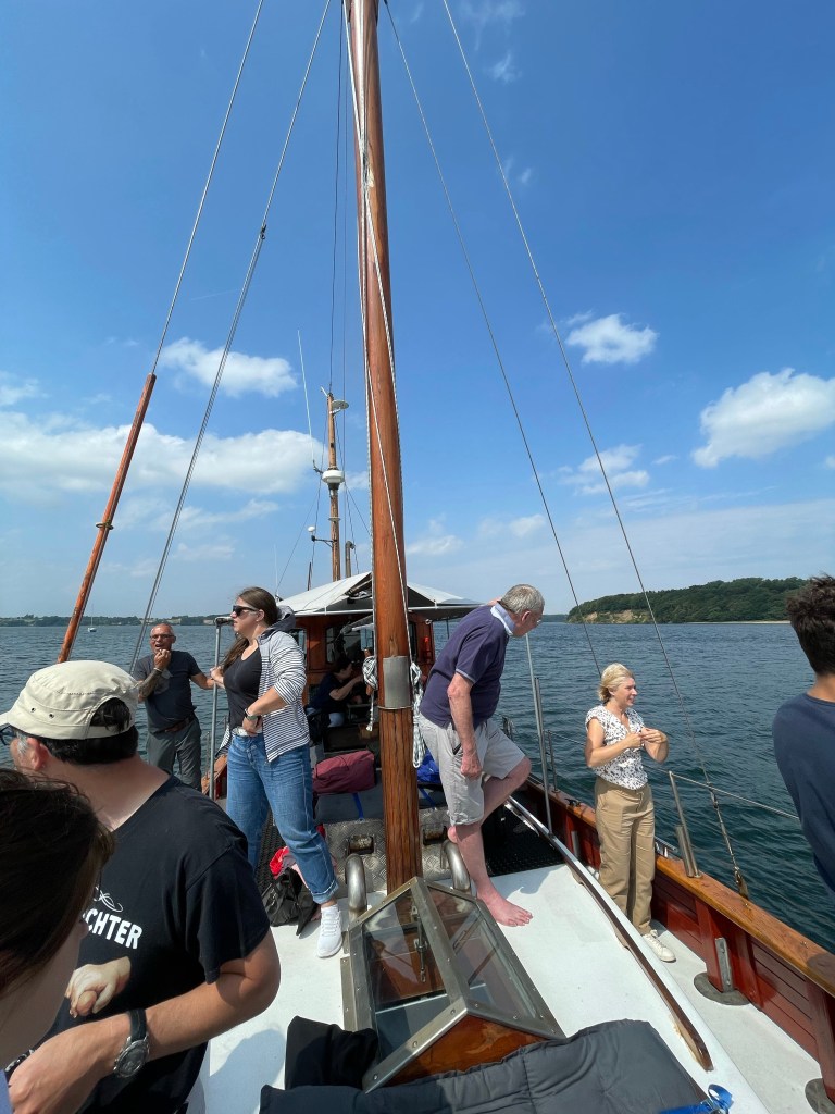 Gegen Mittag wird das Wetter etwas besser und hoffnungsvoll fahren wir nach Middelfart. Es wird immer sonniger und wärmer. Ich hab mich viel zu warm angezogen 😅 pünktlich tuckern wir los, 12 Leute sind auf dem Boot, Belgier und Dänen und 4 weitere Schweizer. Das Wetter ist prächtig, kaum Wind, 25 Grad. Nach etwa 3/4 Stunden sehen wir tatsächlich ein paar Mal eine Rückenflosse oder auch zwei, aber alles geht so unglaublich schnell – keine Chance mit dem Handy. Andy hat es hoffentlich mit der guten Kamera und dem Riesen-Objektiv geschafft. Er fotografiert von ganz zu vorderst und es gibt ja auch noch herrliche Landschaft, Vögel und Segelschiffe zum verewigen. Dann halt keine Schweinswale (sind ähnlich wie Delfine) aber Schiffli fahren ist sowieso unseres und deshalb steigen wir nach 2 Stunden voll happy vom Boot ☺️