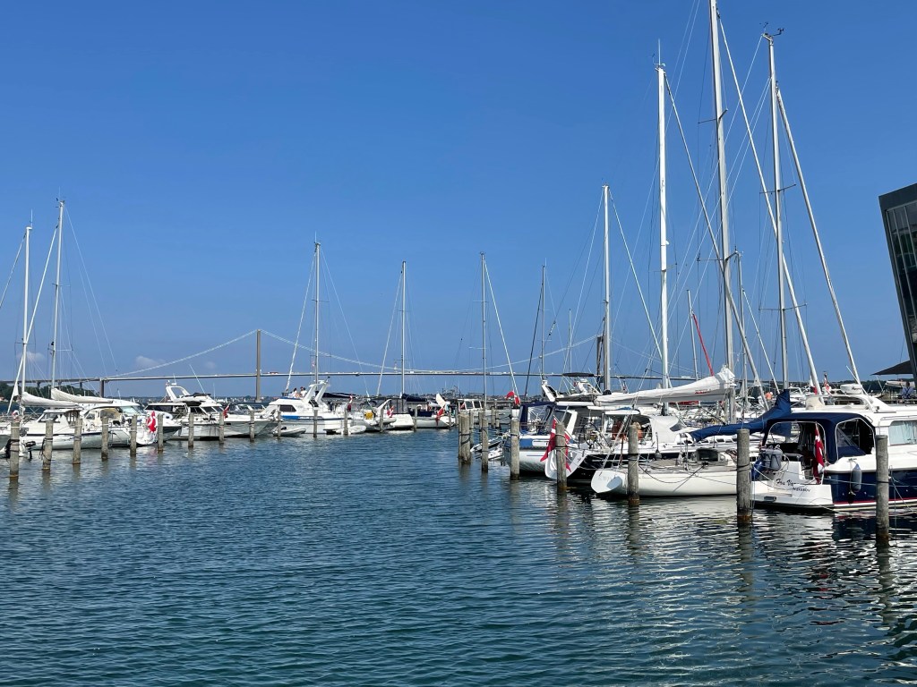 Mitte Vormittag fahren wir nach Middelfart, auf der anderen Seite des Lillebelts, der Jütland und Fynn trennt. Wir gehen direkt zur Touristeninfo am Hafen und buchen für den nächsten Tag (Sonntag) eine 2stündige Bootstour auf der „Sabina“. Ziel: Schweinswale sehen! Etwa 3000 leben hier im „Kleinen Belt“. Bin ja gespannt ob es klappt…