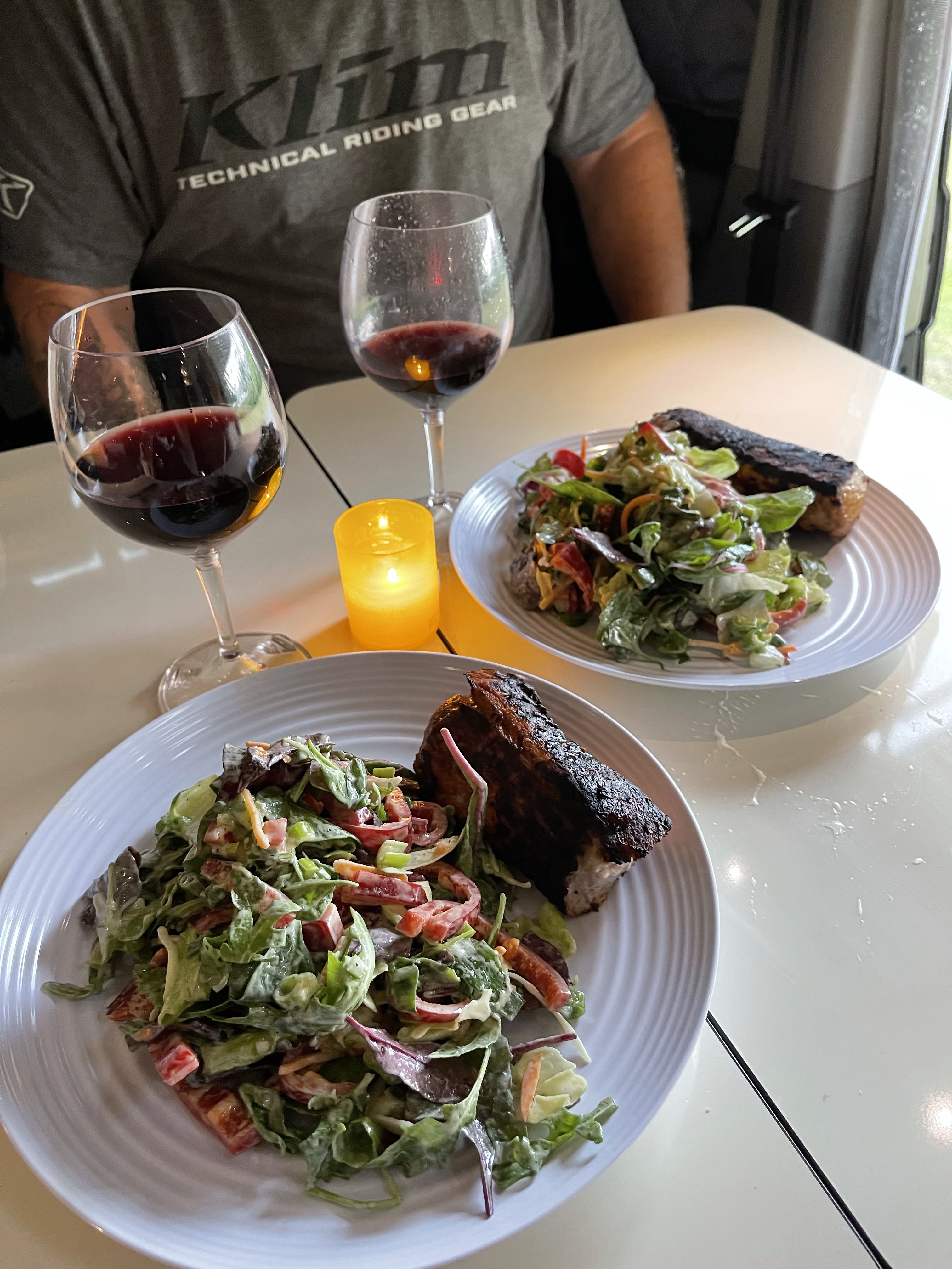 Zum Abschied erleben wir noch ein richtiges Gewitter mit Starkregen, genau als Andy anfängt zu grillieren 💨⛈💦 die Markise fliegt fast davon und beim unteren Fliegengitter-Fenster drückt Wasser rein… aber das Filet mit Salat ist lecker und wir können ja im trockenen Bus sitzen beim Essen.