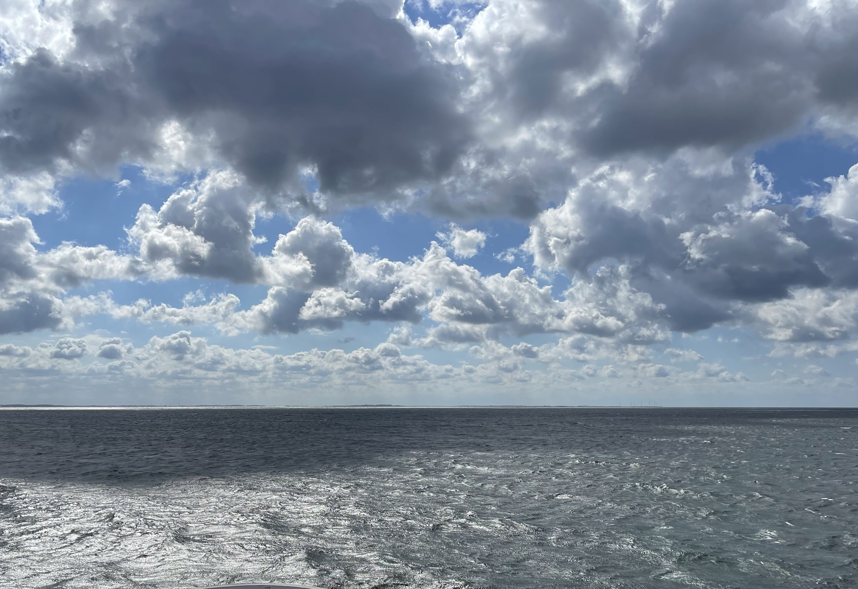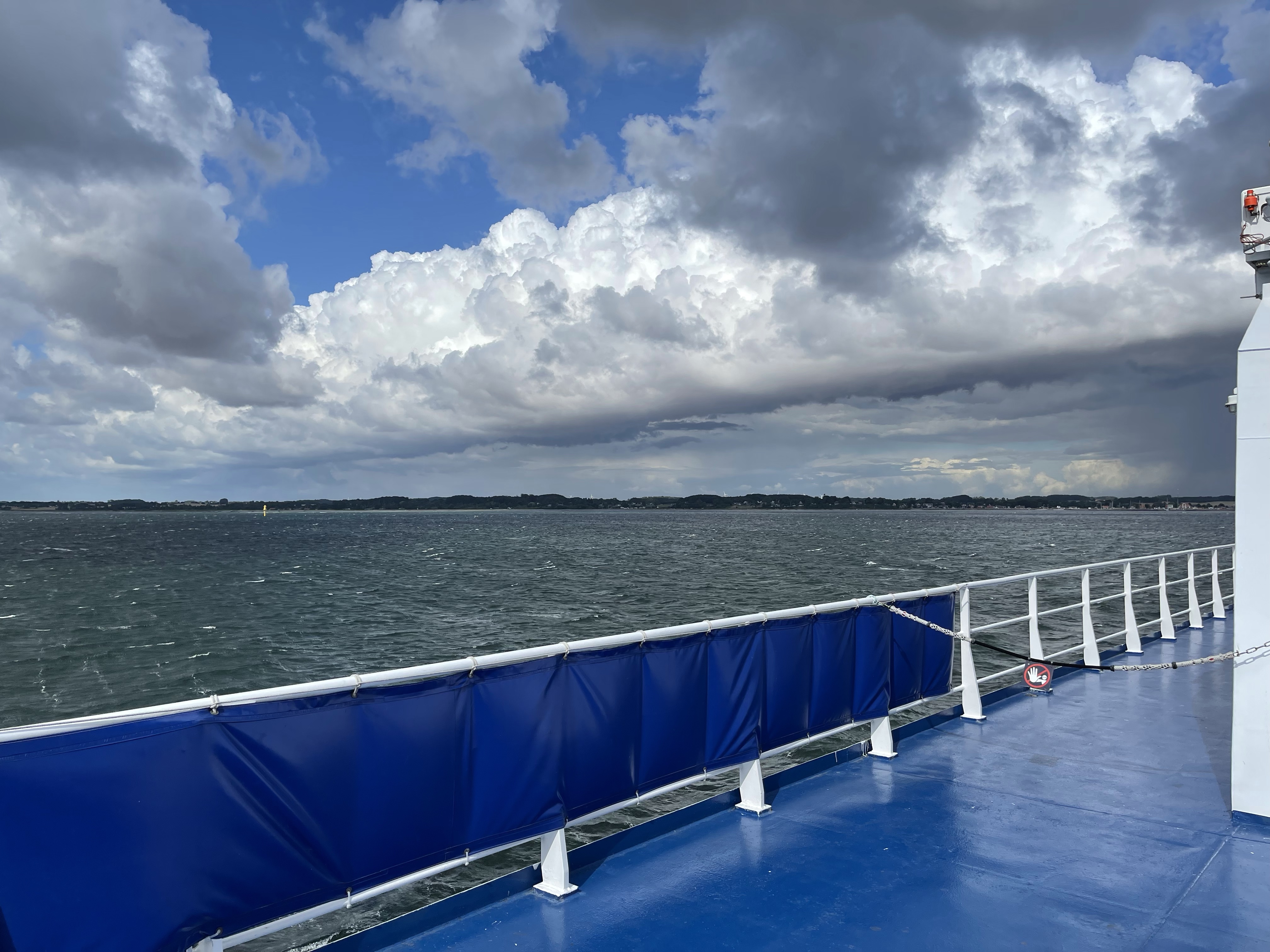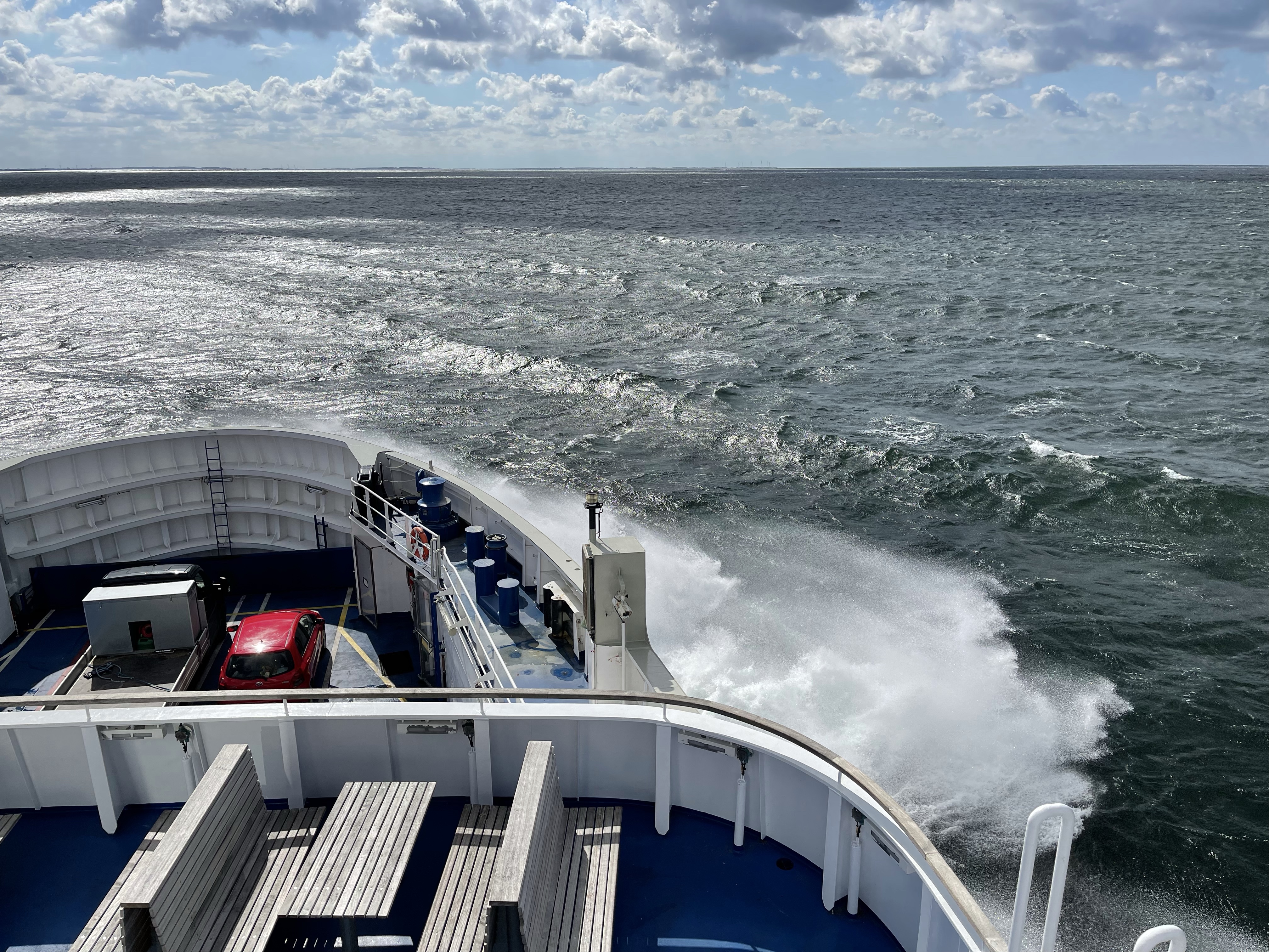 Sehr coole Fähre!!! Es ist sehr windig und alle Wellen haben Schaumkrönchen, Sonne und wilde Wolken wechseln sich ab, herrlicher Ausblick auf dem Vorderdeck !!!